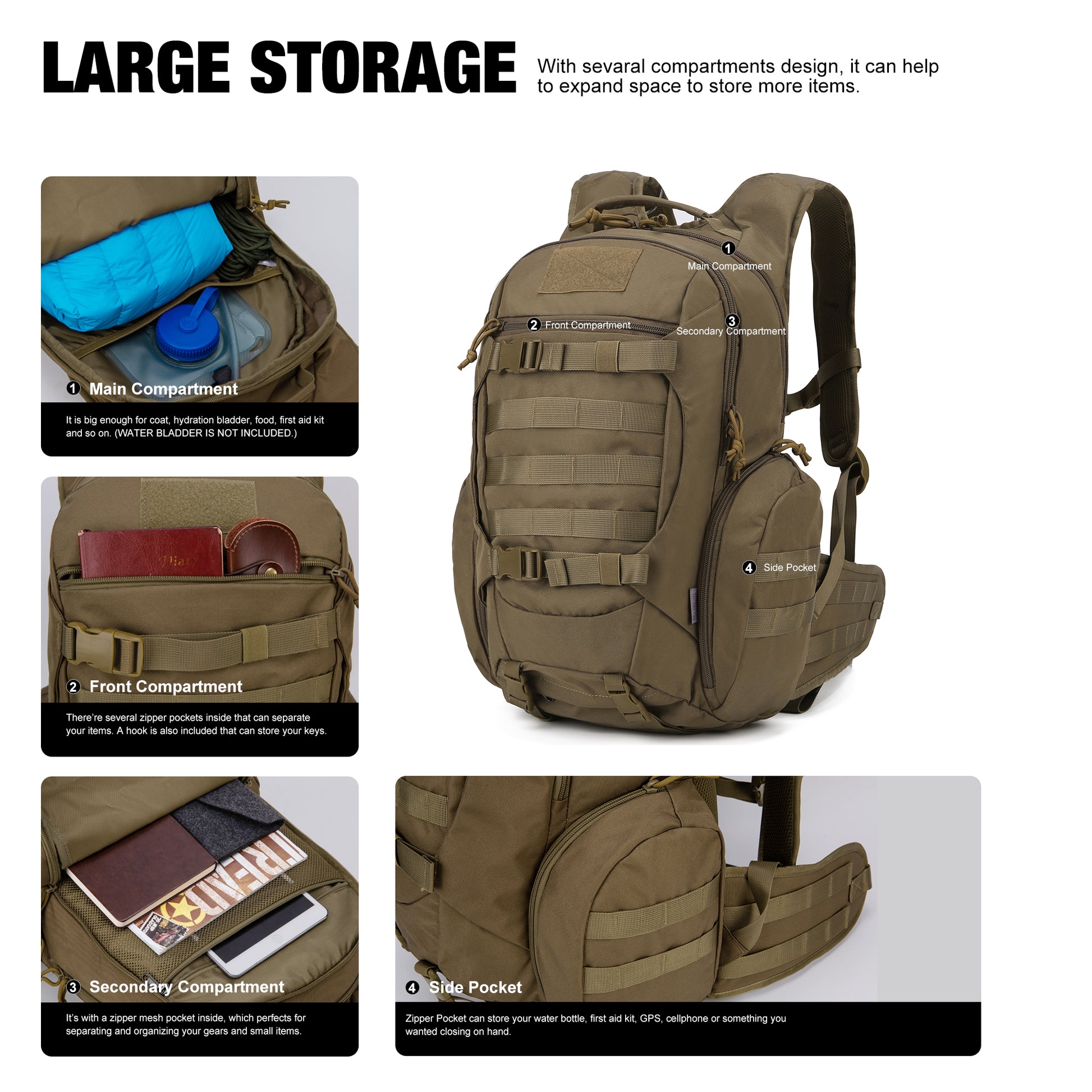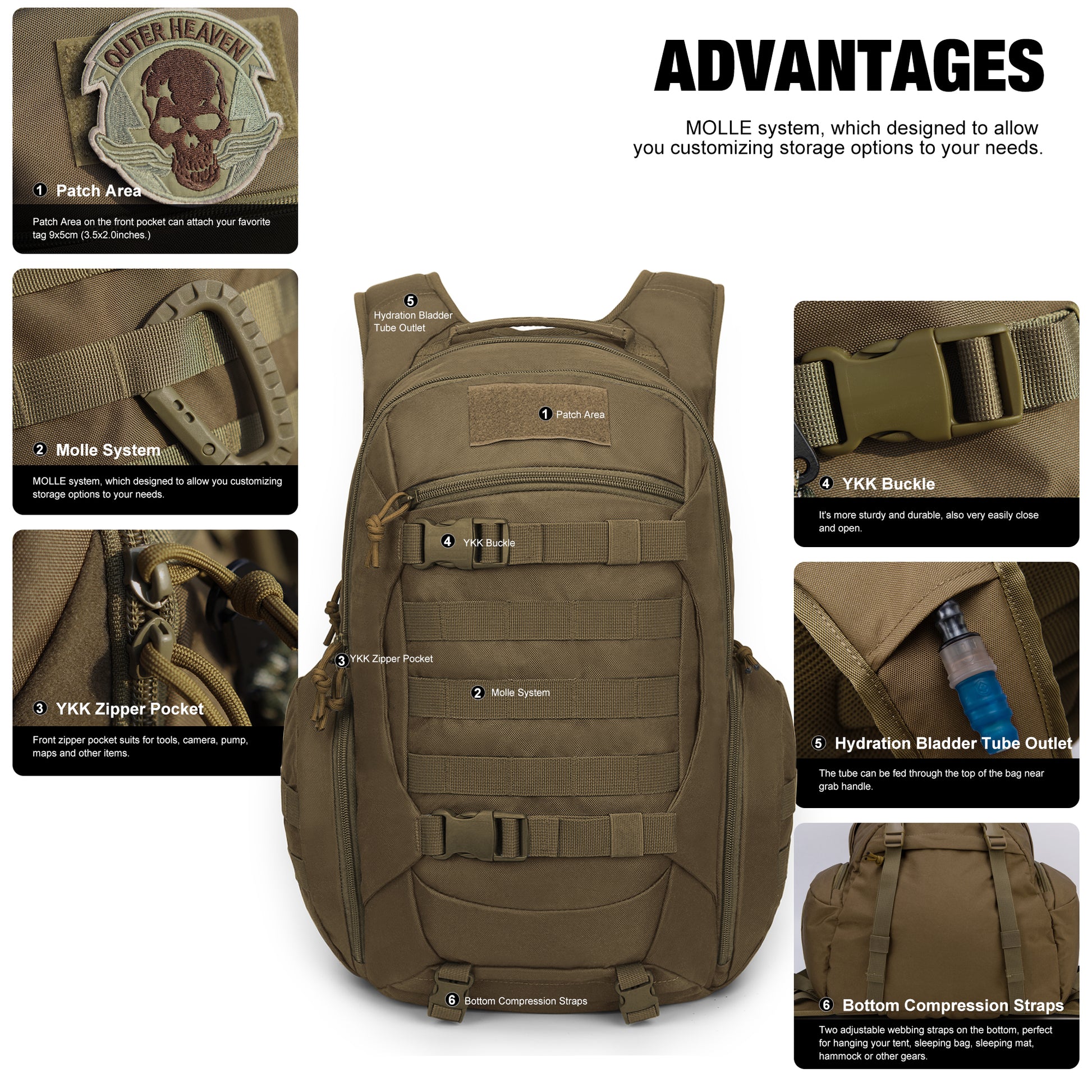 - 【Hydration Compartment】This assault pack with hydration compartment and can hold a 2 Liter hydration bladder (hydration bladder is not included), the tube is fed through the top of the bag near the grab handle.