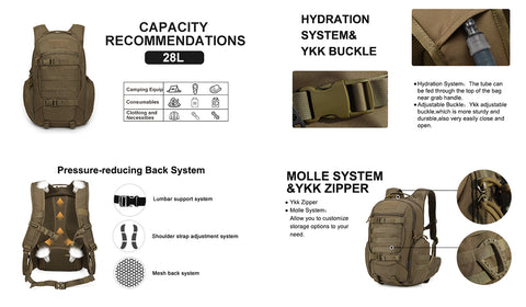 - 【Durable Material】This 28-liter backpack is made of 600D polyester, and the buckles and zippers are made of YKK.