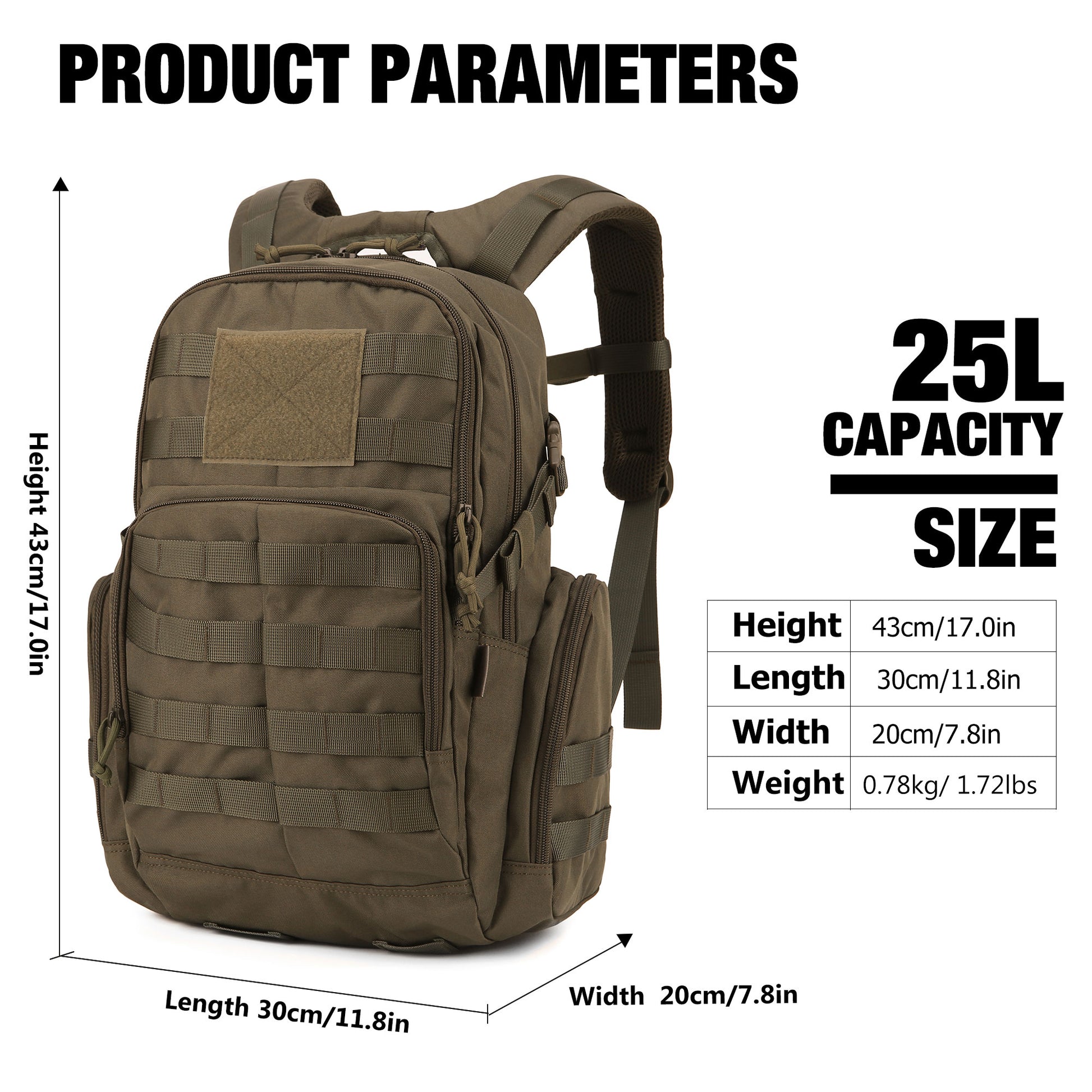 - MATERIAL- 25 Liters. This military backpack is made of 600D Water resistant Polyester. YKK Zipper.The dimensions are 17 inches (height), 11.8 inches (length), and 7.87 inches (width). The length of the entire bag includes the side pocket size.