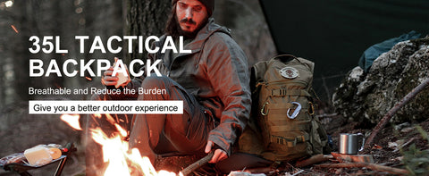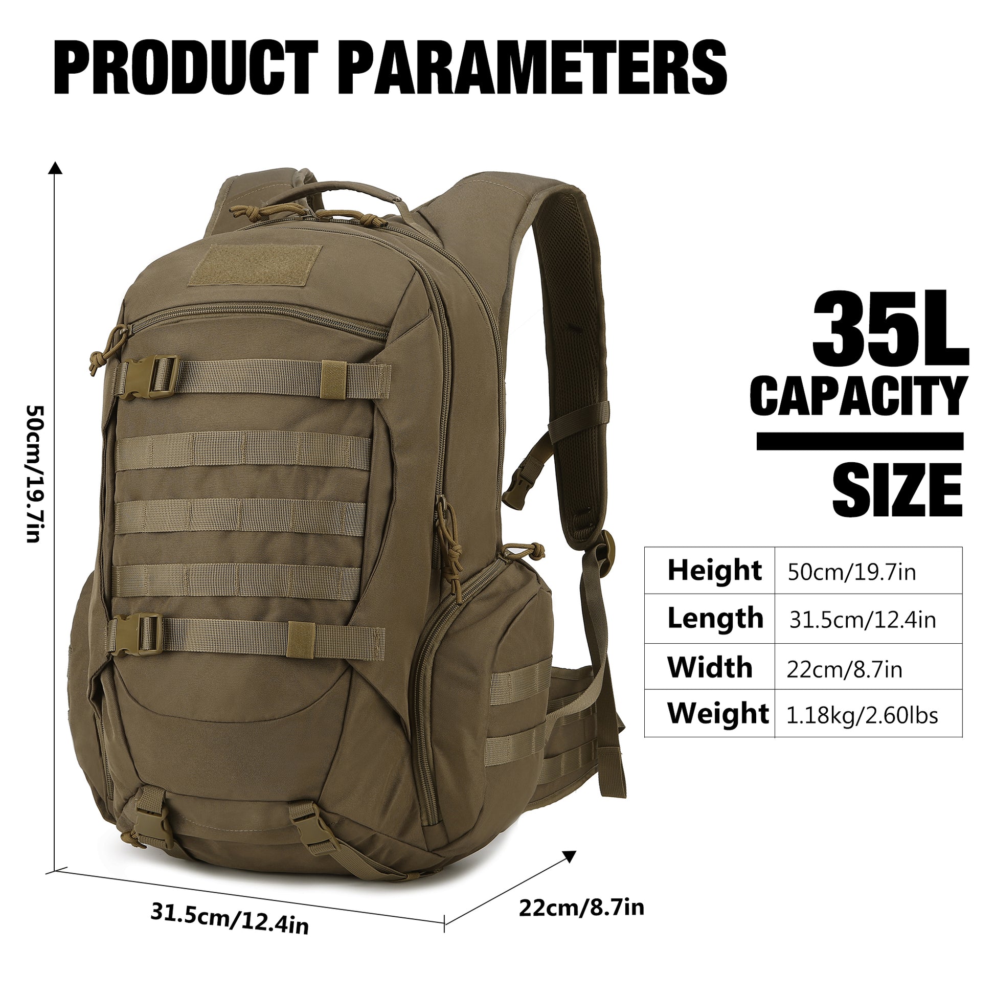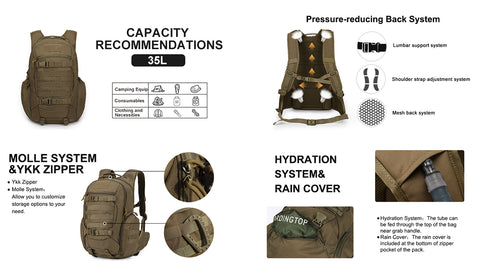 - 【MATERIAL】 35 Liters. This backpack is made of 600D polyester. YKK Zipper.