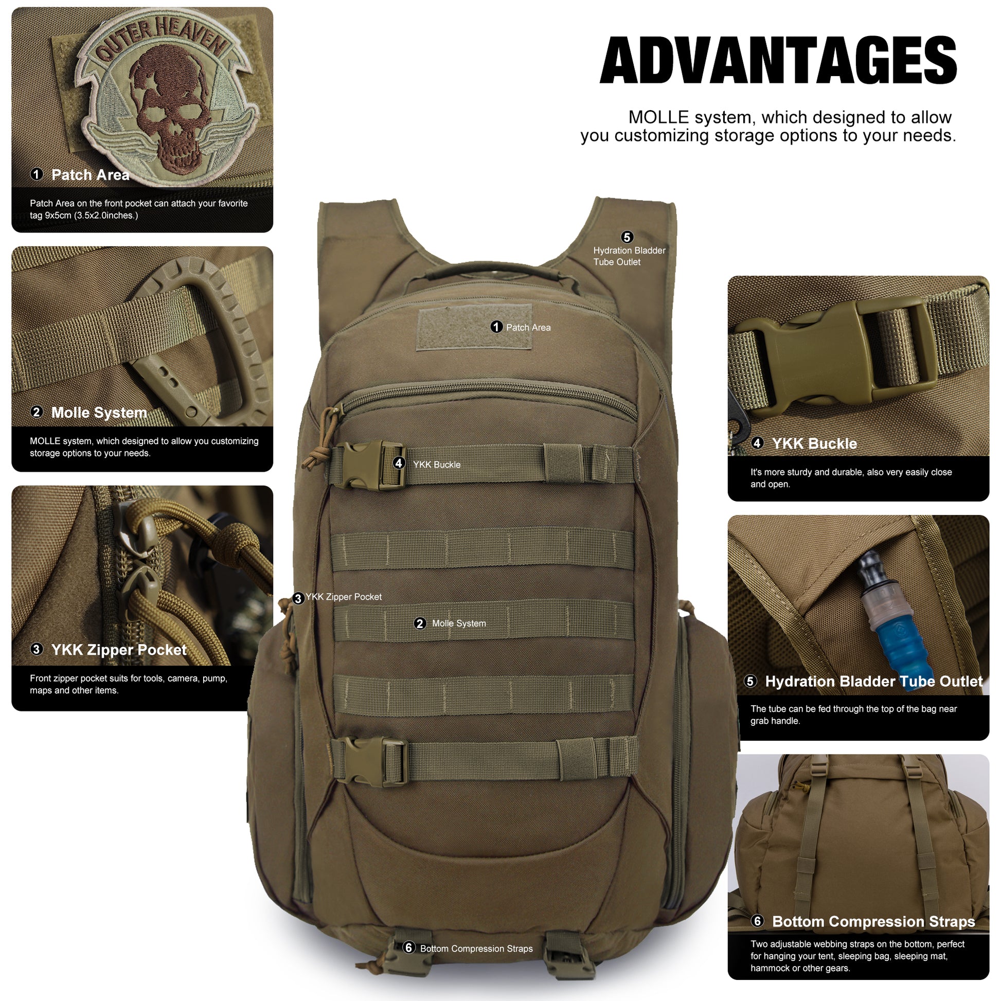 - 【MOLLE WEBBING】 This backpack can hang small items, or for attaching additional pouches or gear. The Backpack also has bottom compression straps, which can hang your sleeping bag, tripod, or tent.