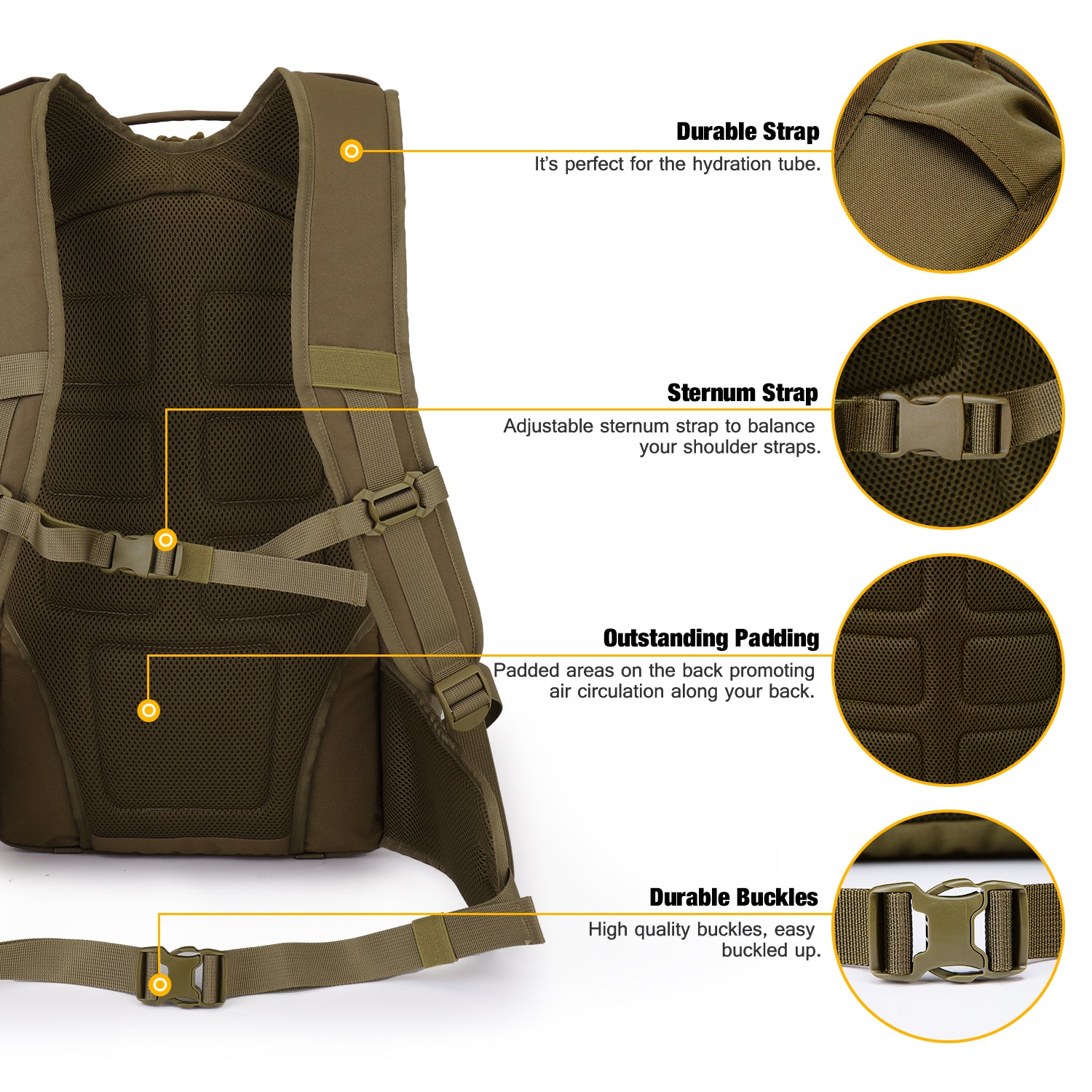 - 【DURABLE & MULTIFUNCTIONAL】This molle backpack with a chest strap can bear the corresponding weight, so it's well used as a 3-day assault pack, trekking backpack, or daypack. Suits for Hiking, Camping, Trekking, Traveling, School, or daily use.