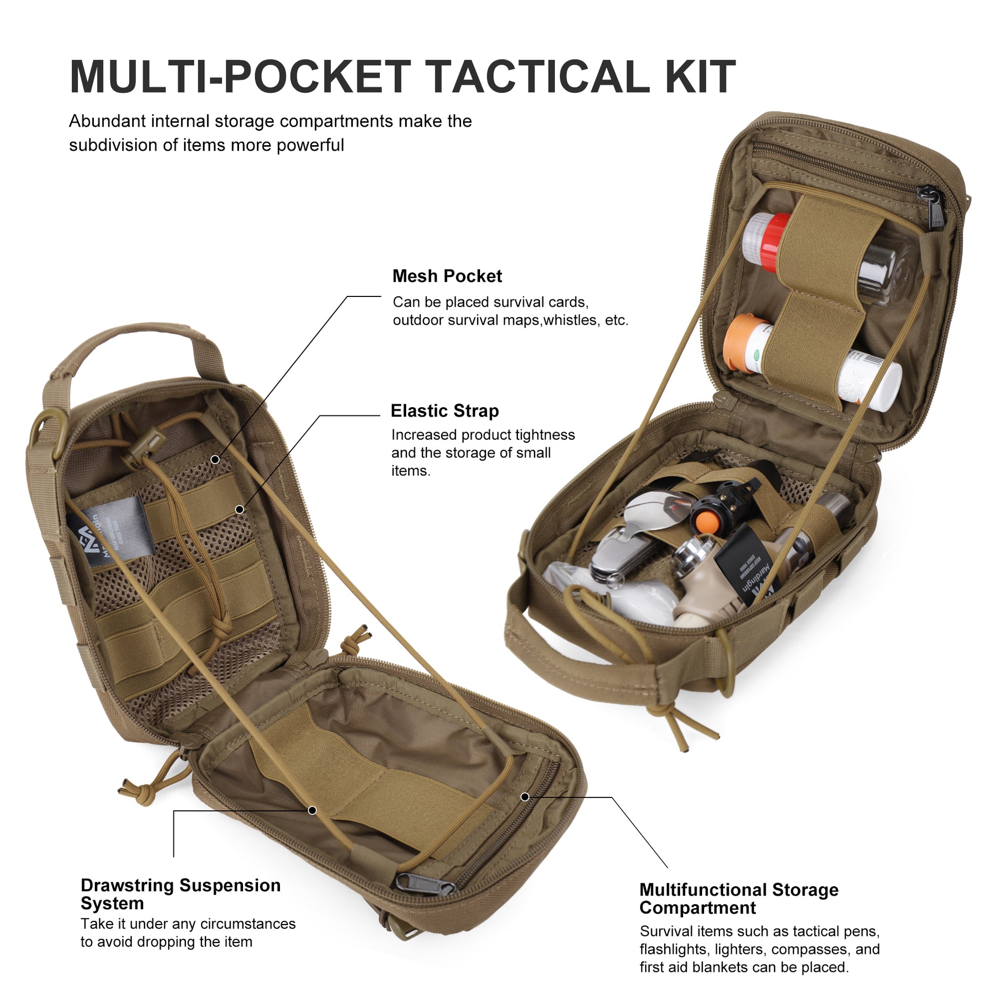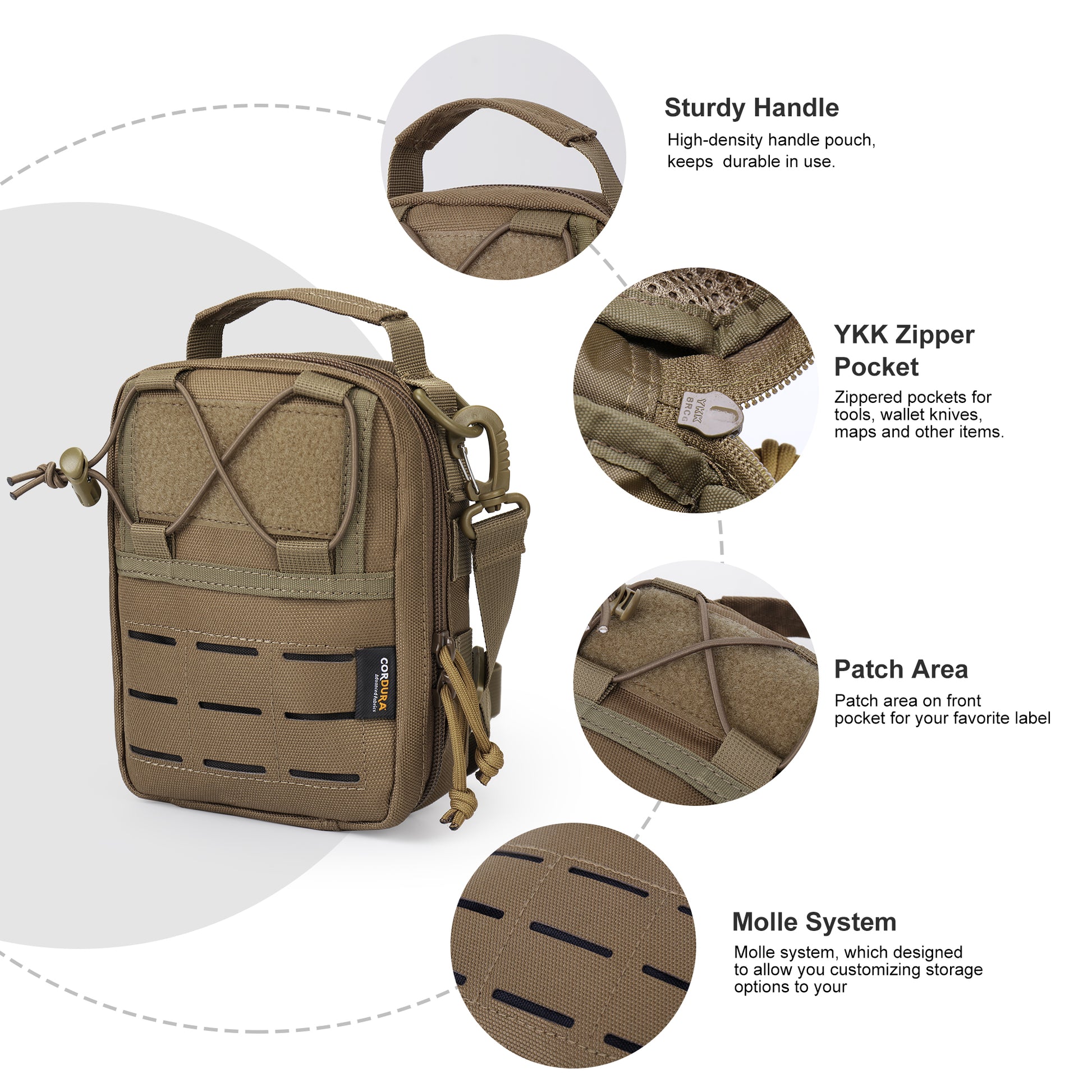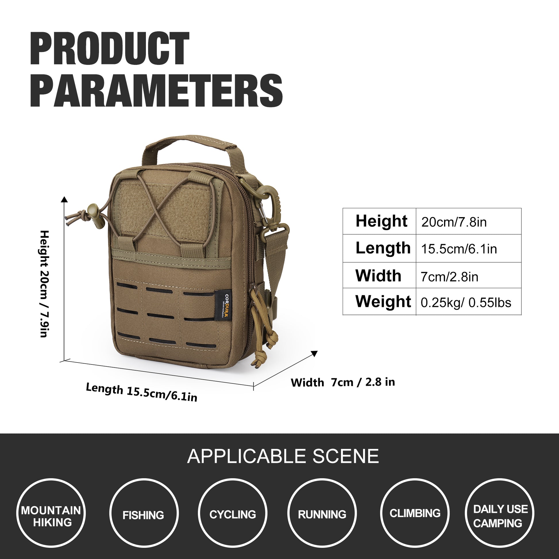 - Durable Material: This Molle pouch is made of advanced 915D Cordura polyester fabric with two-way YKK zippers and YKK buckles. It has two pockets, the main one contains two main compartments and multiple size elastic straps, and the front molle system is cut by laser. Dimensions of this pouch: 7.8×6.1×2.8inches