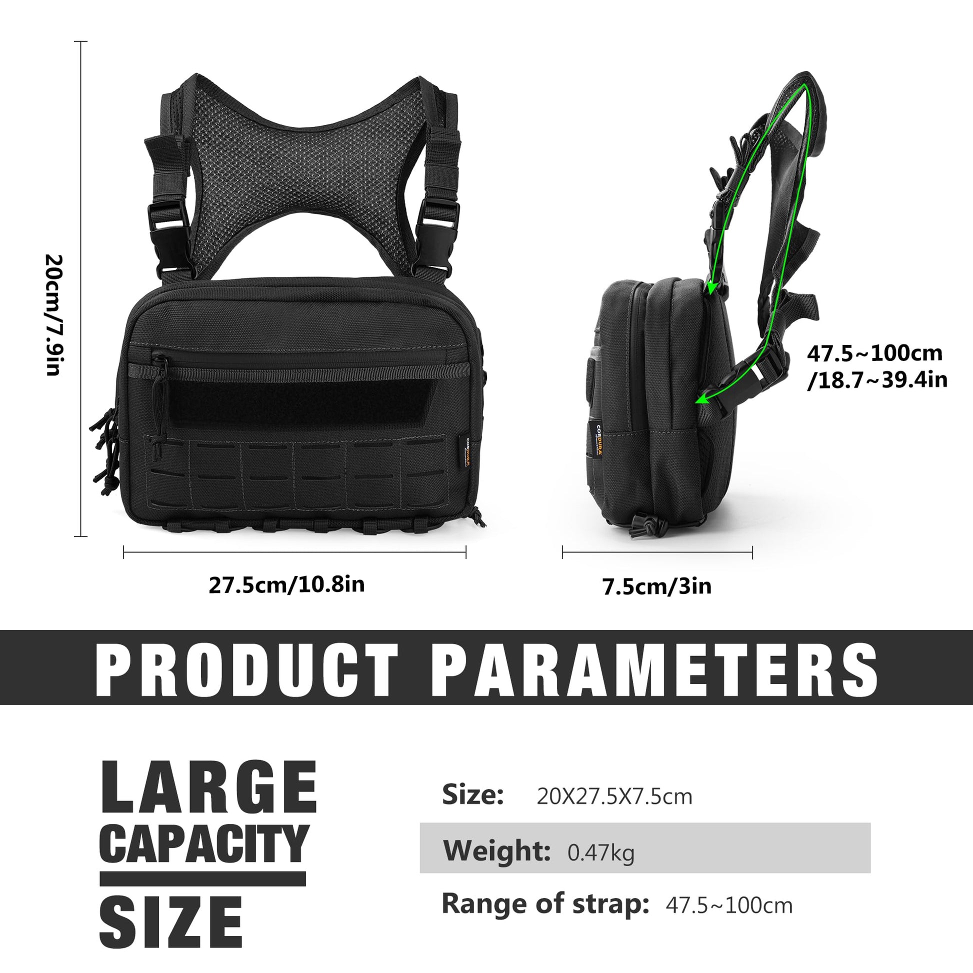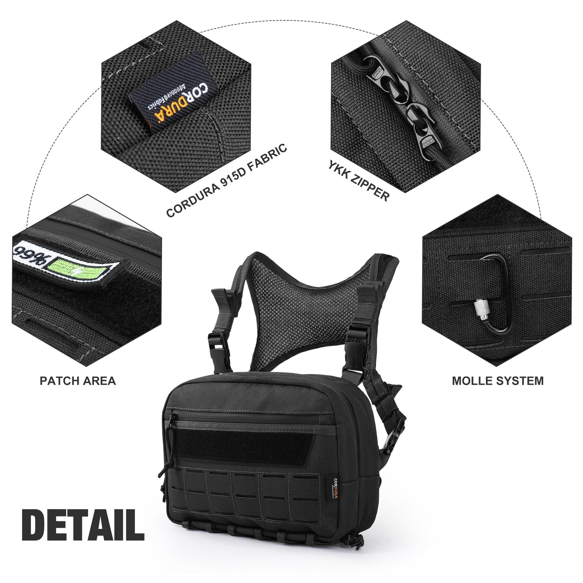 HIGH-QUALITY MATERIAL: This tactical chest bag is made of 915D CORDURA fabric, known for its high strength and abrasion resistance, ensuring long-lasting durability. Its compact and lightweight design, measuring 20 x 27.5 x 7.5 cm and weighing only 0.47 kg, makes it an ideal companion for all outdoor activities.