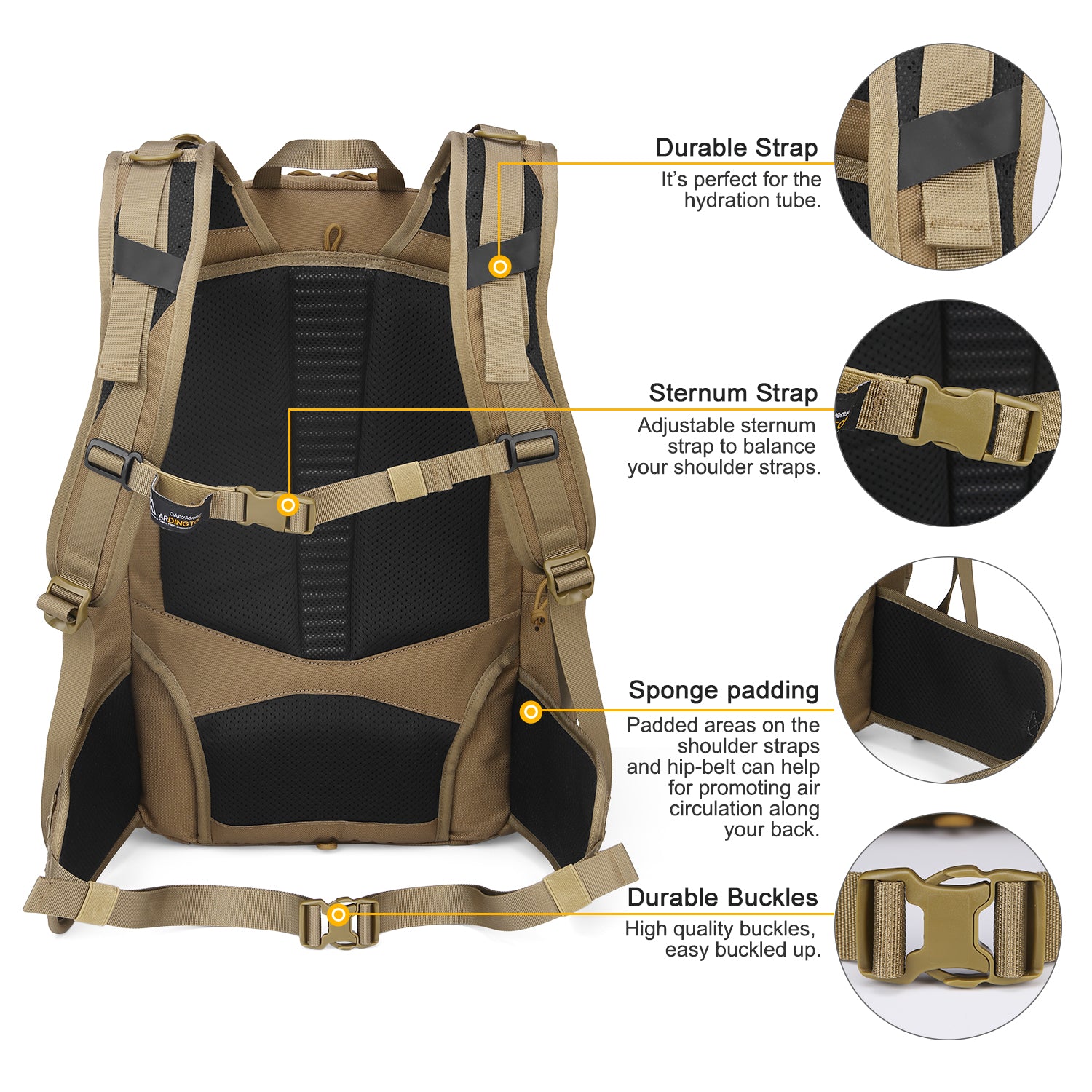 - Comfortable Design: The army backpack is equipped with an adjustable height sternum strap and waist belts. The waist belt can be tucked into the backside when not in use. The back features a breathable, padded mesh system that reduces sweating and provides cushioning comfort, ensuring a comfortable experience during outdoor activities